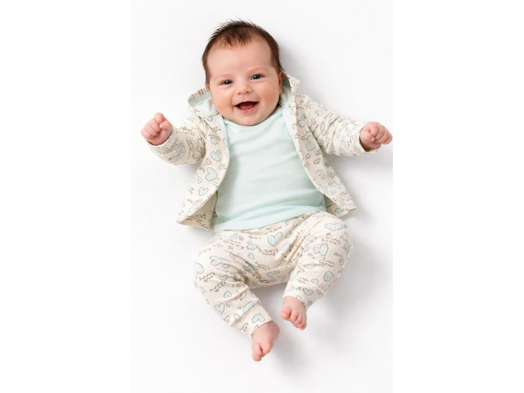 Roztomilá souprava pro miminko, která kombinuje pohodlí a styl. Obsahuje bavlněné body v jemné mátové barvě, tepláčky a mikinu se sladěným vzorem srdíček a nápisů. Ideální outfit na každodenní nošení i návštěvy.